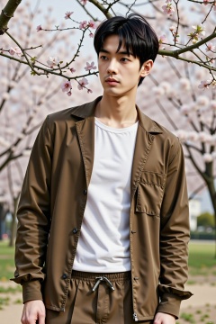 a medium-sized Asian man stands in front of a backdrop of cherry blossom trees. He is dressed in a brown jacket, a white t-shirt, and a pair of brown pants. His hair is short and dark, and his eyes are closed. His lips are slightly parted, as if he is looking to the left. The backdrop is blurred, and the trees are adorned with white flowers, adding a touch of color to the scene.
