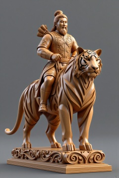 mudiao,(Chinese immortals wooden sculpture,riding on a tiger,gray background,full body,standalone display,geometric patterns,front view,3D art,C4D,3D rendering,light and shadow,depth of field,best quality,8K,super details,ultra-detailed,sharp focus,physically-based rendering,extreme detail description,professional,vivid colors,bokeh,detailed textures,realistic,photo-realistic:1.37),