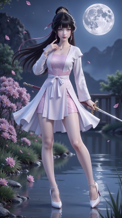 1girl,moon,weapon,sword,dress,long hair,solo,hair ornament,black hair,white dress,petals,night,water,full moon,grass,high heels,full body,,<lora:F1稚圭:0.8>