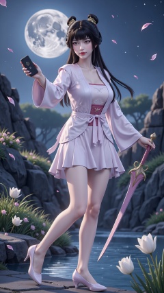 1girl,moon,weapon,sword,dress,long hair,solo,hair ornament,black hair,white dress,petals,night,water,full moon,grass,high heels,full body,,<lora:F1稚圭:0.8>