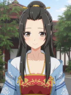 2D style,A girl is wearing blue Chinese clothes outdoors,black hair,black eyes,upper body,smile,
