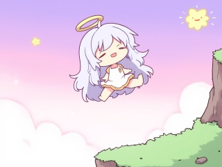 (masterpiece:1.2),(extremely detailed:1.2),(best quality:1.2),(high quality:1.2),(official art:1.2),jbh,<lora:简笔画-智灵-9:0.8>,Anime-style drawing,A digital drawing of a chibi-style character floating in the sky, resembling a small, cute angel. The character has long, flowing silver hair, a halo above its head, and is wearing a simple white dress with gold accents. The character has a small, round face with a pink mouth, closed eyes, and a content expression. The background features a gradient sky transitioning from pink to purple, with fluffy white clouds and a bright yellow star with a smiley face in the upper right corner. The ground below is rocky and green, with a cliff edge on the right side. The style is reminiscent of Japanese anime, with soft, pastel colors and a whimsical, dreamy atmosphere. The lighting is soft and even, with no harsh shadows. The camera angle is straight on, capturing the character in mid-air.