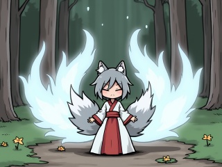(masterpiece:1.2),(extremely detailed:1.2),(best quality:1.2),(high quality:1.2),(official art:1.2),jbh,Anime-style drawing,Digital drawing of a chibi-style character with fox ears and tails,standing on a forest path. The character has short,silver hair and is wearing a white and red kimono. The character is surrounded by multiple glowing,ethereal fox tails that radiate a soft,white light. The background features a dense forest with tall trees and a gentle rain falling,creating a serene and mystical atmosphere. The character is positioned in the center of the image,facing slightly to the right,with a small yellow butterfly fluttering near their feet. The lighting is soft and diffused,with a gentle glow from the fox tails illuminating the character. The camera angle is straight-on,capturing the character and the surrounding environment in a balanced composition. The art style is clean and polished,with smooth lines and vibrant colors.,<lora:古风简笔画-autodl-11.26-000009>,
