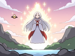 (masterpiece:1.2),(extremely detailed:1.2),(best quality:1.2),(high quality:1.2),(official art:1.2),jbh,<lora:简笔画-智灵-9:0.8>,Anime-style drawing,A digital illustration in a cartoon style features a serene, mystical scene. The central figure is a floating, ghostly woman with long, flowing silver hair, wearing a white and red kimono with a red sash. She has a peaceful expression and is surrounded by a radiant, golden aura with star-like sparks emanating from her head. Her hands are clasped in front of her chest, and she appears to be floating above a body of water, with a mountain and lush greenery in the background. To the left, a small, yellow bird-like creature with a white face and black wings is flying towards her. The sky is a gradient of pink and purple, with fluffy white clouds. The lighting is soft and warm, creating a tranquil and otherworldly atmosphere. The camera angle is slightly below eye level, looking up at the woman.