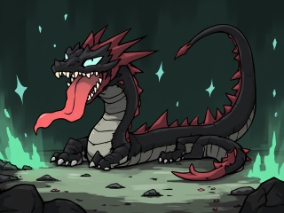 (masterpiece:1.2),(extremely detailed:1.2),(best quality:1.2),(high quality:1.2),(official art:1.2),jbh,<lora:简笔画-智灵-9:0.8>,Anime-style drawing,A digital drawing of a large, menacing creature with a snake-like body, resembling a dragon or a beast from a fantasy setting. The creature has a dark, armored body with red accents, and its head is adorned with sharp, angular features and glowing, cyan eyes. The creature's mouth is wide open, revealing large, sharp teeth and a long, red tongue that is extended outwards. The background is dark and foreboding, with a dim, greenish light illuminating the creature. The ground is rocky and uneven, and there are some small plants and debris scattered around. The creature's design is reminiscent of a mix between a dragon and a snake, with a muscular, scaly body and a long, flexible tail. The drawing style is detailed and dynamic, with a focus on the creature's menacing and powerful appearance. The image is well-lit, with a strong contrast between the dark background and the brightly lit creature.