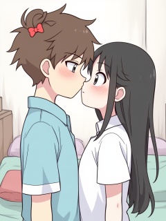 (masterpiece:1.2),(extremely detailed:1.2),(best quality:1.2),(high quality:1.2),(official art:1.2),jbh,<lora:简笔画-智灵-9:0.8>,Anime-style drawing,A digital anime-style drawing of a young man and woman standing close together,facing each other. The man has short brown hair tied back with a red hair tie,and he is wearing a light blue shirt. The woman has long black hair and is wearing a white shirt. Both characters have blushing cheeks,and the woman's eyes are wide open,looking up at the man. The background is a simple bedroom with a bed and pillows,and the lighting is soft and even. The camera angle is a close-up,focusing on the characters' faces and upper bodies. The drawing has a clean and polished style,with smooth lines and soft shading. The overall mood is intimate and slightly romantic. The characters' expressions suggest a moment of shared emotion or connection. The image has a warm and gentle color palette,with muted tones and soft highlights.,