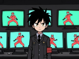 (masterpiece:1.2),(extremely detailed:1.2),(best quality:1.2),(high quality:1.2),(official art:1.2),jbh,<lora:简笔画-智灵-9:0.8>,Anime-style drawing,Anime-style drawing of a young boy with spiky black hair and intense yellow eyes, standing in front of a row of computer monitors displaying the same image of a person in a red suit with a red mask and black gloves, striking a dynamic pose. The boy is wearing a black military-style uniform with white accents and a red armband on his right arm. The background is a dark, futuristic control room with dim lighting, and the monitors are glowing with a greenish hue. The boy has a serious and determined expression, with a slight frown. The image has a dramatic and intense atmosphere, with a focus on the boy's powerful presence. The drawing style is clean and detailed, with bold outlines and vibrant colors. The camera angle is straight-on, capturing the boy's full body and the monitors behind him.