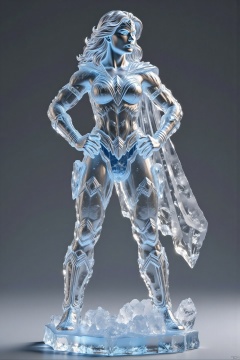 bingdiao,(best quality,4k,8k,highres,masterpiece:1.2),ultra-detailed,(realistic,photorealistic,photo-realistic:1.37),ice and crystal statue,Wonder Woman figurine,stands ground,gray background,cape flows,hands on hips,face turned side,looking off-frame,shiny surface,frosty texture,detailed cape,defined muscles,serious expression,strong jawline,beautiful detailed eyes,beautiful detailed lips,extremely detailed eyes and face,long eyelashes,crystal clear details,sharp focus,studio lighting,physically-based rendering,extreme detail description,professional,vivid colors,cool tones,soft shadows,highlighted edges,ice sculpture,crystal art,heroic pose,comic book style,modern art,sculpture,translucent,glittering,reflections,icy atmosphere,subtle gradients,high contrast,smooth transitions