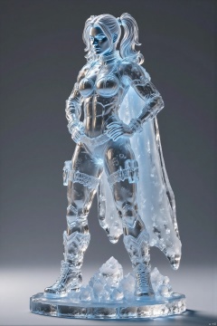 bingdiao,(best quality,4k,8k,highres,masterpiece:1.2),ultra-detailed,(realistic,photorealistic,photo-realistic:1.37),ice and crystal statue,Harley Quinn figurine,stands ground,gray background,cape flows,hands on hips,face turned side,looking off-frame,shiny surface,frosty texture,detailed cape,defined muscles,serious expression,strong jawline,beautiful detailed eyes,beautiful detailed lips,extremely detailed eyes and face,long eyelashes,crystal clear details,sharp focus,studio lighting,physically-based rendering,extreme detail description,professional,vivid colors,cool tones,soft shadows,highlighted edges,ice sculpture,crystal art,heroic pose,comic book style,modern art,sculpture,translucent,glittering,reflections,icy atmosphere,subtle gradients,high contrast,smooth transitions