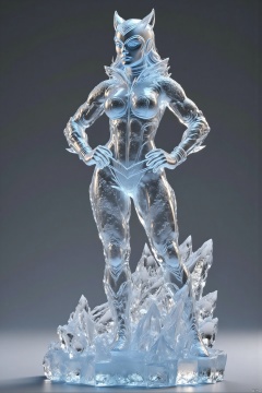 bingdiao,(best quality,4k,8k,highres,masterpiece:1.2),ultra-detailed,(realistic,photorealistic,photo-realistic:1.37),ice and crystal statue,Catwoman figurine,stands ground,gray background,cape flows,hands on hips,face turned side,looking off-frame,shiny surface,frosty texture,detailed cape,defined muscles,serious expression,strong jawline,beautiful detailed eyes,beautiful detailed lips,extremely detailed eyes and face,long eyelashes,crystal clear details,sharp focus,studio lighting,physically-based rendering,extreme detail description,professional,vivid colors,cool tones,soft shadows,highlighted edges,ice sculpture,crystal art,heroic pose,comic book style,modern art,sculpture,translucent,glittering,reflections,icy atmosphere,subtle gradients,high contrast,smooth transitions