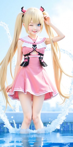 1girl, solo, long hair, looking at viewer, smile, open mouth, bangs, blue eyes, blonde hair, twintails, one eye closed, water, cosplay, splashing