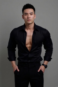 jzns,dsh,1man,asian,handsome,male focus,solo,hansome,charming,muscular,realistic,1boy, pectorals, black shirt, open shirt, watch, hands in pockets, black pants, chest hair, bust,masterpiece,realistic,best quality,highly detailed,highres,jzns,shx