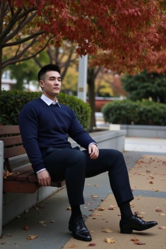 jzns, 1man,fashion model,asian, extremely delicate facial,,handsome,Business fashion,wearing sweater,shirt,pants,dark glossy socks,Oxford style footwear,sitting quietly with a smile,outdoors,autumn,in the garden,red Maple leaf,natural light,extremely detailed cg 8k wallpaper,magnificent,,masterpiece, realistic, best quality, highly detailed,plsw,shx