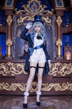 a woman in furina cosplay costume, she is wearing white shirt with black ascot and blue bow sash and long sleeves dark blue jacket and white shorts and asymmetrical gloves, and black high heels with bow and thigh strap and white frilled socks, she has blue and white hair with ahoge and blue top hat. The background is a magnificent cosplay stage, with only her on stage, detail background, full length shot,