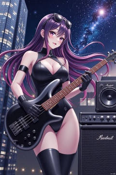 in dynamic angle A breathtaking flat-colored anime screencap showcases in a captivating big-breasted cougar,embodying the harmonious blend of artistry and sensuality.The dynamic-pose finds her donning a punk-inspired highleg leather leotard, leather thighboots,eargear,sunglasses above head,and elbow-length gloves,with flowing multicolored streaked long hair framing the scene.As she plays a black bass guitar, swirling musical notation swirls around her. Amidst skyscraper with speaker,amplifier and star-trail with galaxy backdrops, her expressive features radiate energy and artistic passion, drawing the viewer into the midst of her creative fervor.