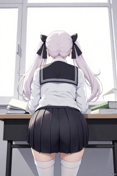 1girl, solo, long hair, skirt, shirt, hair ornament, thighhighs, long sleeves, bow, ribbon, twintails, school uniform, hair ribbon, white shirt, ass, white hair, hair bow, pleated skirt, indoors, black skirt, sailor collar, from behind, white thighhighs, two side up, book, window, black ribbon, no shoes, all fours, desk, black sailor collar,