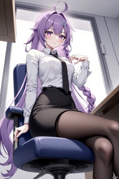 1girl, solo, long hair, breasts, looking at viewer, bangs, skirt, breasts, shirt, hair ornament, long sleeves, holding, sitting, very long hair, closed mouth, purple eyes, white shirt, purple hair, braid, pantyhose, thighs, necktie, alternate costume, collared shirt, indoors, black skirt, mole, , mole under eye, chair, from below, crossed legs,black necktie, desk,, pencil skirt, braided ponytail, office lady,office,