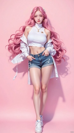 1girl, solo, long hair, breasts, looking at viewer, blue eyes, large breasts, shirt, long sleeves, navel, bare shoulders, jewelry, very long hair, standing, full body, white shirt, pink hair, earrings, shoes, shorts, midriff, pink eyes, necklace, off shoulder, star \(symbol\), lips, crop top, short shorts, clothing cutout, bare legs, shadow, turtleneck, wavy hair, pink background, white footwear, denim, sneakers, denim shorts, shoulder cutout, cutoffs