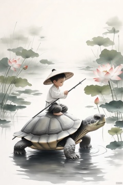 国风,This is a Chinese brush painting style illustration of a young boy in traditional costume sitting on top of the head of a large turtle. The child holds a slender pole in his hand and is surrounded by a tranquil pond dotted with lotus and flowers. Gentle waves of water and soft pastel colors create a serene atmosphere. The child's conical hat shades them from the sun on what is a warm and calm day.