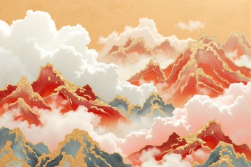 Chinese Style,a detailed detailed painting captures a stunning backdrop of mountains and clouds. The mountains are adorned with a variety of vibrant colors, including red, white, and blue, adding a touch of contrast to the overall composition. The clouds are wavy, adding texture and depth to the scene. The sky is a muted yellow, with a few wispy clouds in the air, adding depth and texture to the composition.