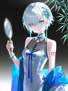 (artist:onineko:0.826446),artist:hito komoru,(artist:quasarcake:1.1),(artist:reoen:0.826446),artist:machi,(7769:1.21),senryoko,vocaloid,vsinger \(vocaloid\),yanhe,1girl,aqua eyes,bamboo,bare shoulders,blue ribbon,blurry,bracelet,china dress,chinese clothes,collar,depth of field,dress,gradient background,grey background,grey dress,hair between eyes,hair ornament,hand mirror,hand up,holding,holding mirror,iridescent,jewelry,leaf hair ornament,light particles,light smile,looking at viewer,mirror,one eye covered,reflection,ribbon,see-through clothes,short hair,solo,white collar,white hair,best quality,amazing quality,very aesthetic,absurdres,best quality,masterpiece,