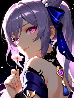 1girl, Keqing Genshin Impact, Opulent Splendor, glowing eyes, lips, thin lips, solo, looking at viewer, charming smile, holding flower, chupa chups, upper body, from below, back lighting, dark, multicolored background, masterpiece, cherry blossom, best quality, very aesthetic