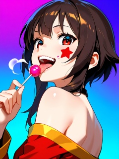 1girl, Megumin, bare shoulders, teeth, lips, thin lips, narrow mouth, solo, looking at viewer, open mouth, holding lollipop, chupa chups, upper body, from below, back lighting, dark, multicolored background, colorful, masterpiece, best quality, grin, greed on his face, his tongue sticking out, a little steam from the mouth
