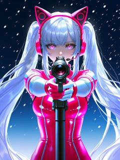 artist:john_kafka,artist:nixeu,artist:quasarcake, darkness, 1girl, sniper rifle, looking through scope, alicedef, pink eyes, white hair, twintails, very long hair, bangs, headset, fake animal ears, animal ear headphones, shrug \(clothing\), long sleeves, medium breasts, pink bodysuit, latex bodysuit, multicolored gloves, pink gloves, white gloves,  holding weapon, holding gun,  aiming at viewer,  happy, snowing, winter,   masterpiece, best quality, very aesthetic, absurdres