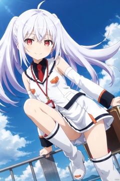 1girl  ,solo,  long hair  ,red eyes , twintails  ,ahoge,  white hair ,white boots  ,detached sleeves,  necktie  uniform,masterpiece,best quality,official art,extremely detailed CG unity 8k wallpaper, One leg up, one leg downSideways,(smile:1.4),(blush:1.4),standing,open the mouth,gape,from below