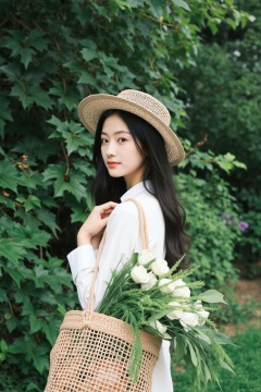 a medium-sized Asian girl with long black hair, wearing a white long-sleeved shirt and a straw hat, stands in front of a backdrop of lush green foliage. She is holding a woven woven bag, adorned with a bouquet of white roses and green leaves. Her left hand is draped over the bag, adding a touch of contrast to her outfit.