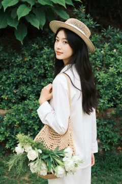 a medium-sized Asian girl with long black hair, wearing a white long-sleeved shirt and a straw hat, stands in front of a backdrop of lush green foliage. She is holding a woven woven bag, adorned with a bouquet of white roses and green leaves. Her left hand is draped over the bag, adding a touch of contrast to her outfit.