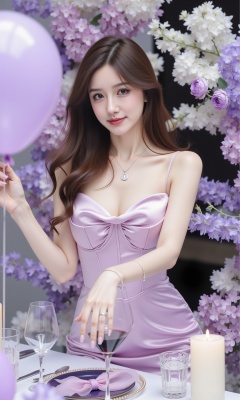 The photograph features a young Asian woman with fair skin and long, straight brown hair cascading over her shoulders. She is wearing a form-fitting, lavender satin gown with spaghetti straps and a sweetheart neckline, accentuating her slender physique and modest breast size. Her makeup is elegant, with a soft pink lip color and subtle eye makeup that enhances her large, expressive eyes. She wears a delicate silver necklace with a small pendant and a silver bracelet on her left wrist.The setting is a luxurious, floral-filled room with an abundance of purple and white flowers, creating a romantic and whimsical atmosphere. The background features a lush arrangement of flowers with large, fluffy lavender petals and delicate white ones, providing a soft, dreamy backdrop. A large, partially deflated purple balloon is on the left side of the frame, adding a playful touch.In the foreground, there is a table adorned with a white tablecloth, a glass of red wine, and a lit white candle. The table also has a glass of water and a small, ornate glass with a floral design, adding to the elegant ambiance. The overall mood is one of opulence and sophistication, with a touch of whimsy and romance.<lora:紫色韵味FLUX:1>