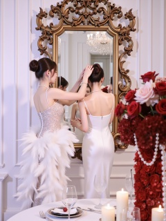 This is a high-resolution digital photograph capturing a luxurious, elegant setting. The image features two women, one standing and one seated, in front of a large, ornate, gold-framed mirror. The standing woman, with her back to the camera, is wearing an elegant, off-the-shoulder white gown with a voluminous, feathery train. Her hair is styled in an intricate updo. The seated woman, facing the camera, has a slender figure and wears a similar white gown with a sweetheart neckline and a delicate, sparkling necklace. She is adjusting the other woman's hair, demonstrating a close, intimate bond. The background features a sophisticated interior with white walls adorned with decorative elements, including a chandelier. The room is elegantly lit, with soft, diffused light enhancing the luxurious atmosphere. In the foreground, a table setting includes tall, clear glass candlesticks, white taper candles, and a small plate with a single red cherry. A large, dramatic bouquet of red roses is placed in the right corner, adding a touch of vibrant color to the scene. The overall mood is opulent and refined, with a focus on elegance and intimate connection.<lora:紫色韵味FLUX:1>