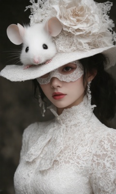 A medium close-up of a hubggirl. She is wearing a lace filigree needle point mask that is intricately painted and sewn, giving a dreamy gothic look. Her hat is ultra detailed lace with fine decorative stitching and has an ultra-fluffy white tiny mouse on the brim. The atmosphere, environment, and material textures all have a stained wet looking mossy appearance. She has a ruddy complexion with pink lipstick. Her dress is extravagant and she gives the impression of an elegant girl, a female spy, a haunting beautiful young woman, and a super-hero girl. She is also like a mistress in a burnt umber red rococo style. There is a broad brimmed white hat and an ultra close-up of a tiny little door mouse in a raindrop on the brim of her hat. The overall photo is a half body shot with 8k resolution and a photoshop render.