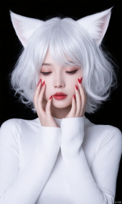 A solo hubggirl with an ultra-wide field view. She has short wavy white hair with bangs that falls between her eyes. Her hair is curly and she has long fingernails painted with nail polish. She has cat ears on top of her head and red eyes. She is looking at the viewer with a closed mouth. She is wearing a long-sleeved top. The background is black and the lighting is ultra-dynamic creating amazing shadows and depth of field. She has an androgynous look and there is 1 other element in focus.
