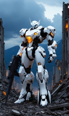 (masterpiece, best quality:1.2), Giant mecha, Vital Suits , building, city, city lights, cityscape, cloud, cloudy sky, destruction, evening, glowing, Luminous mecha, Complex mecha structure, White, orange, and black mecha, Strong mecha body, Multi light source mecha, Giant mecha firearms, full body, Super complex mechanical structure, holding gun, mecha, mountain, no humans, outdoors, power armor, realistic, ruins, science fiction, sky, skyline, skyscraper, smoke, weapon,