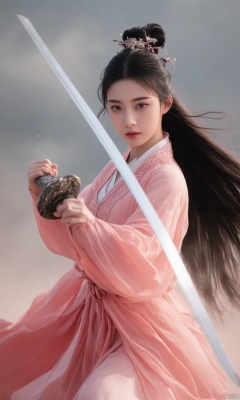 girl swinging a sword, dynamic transfer, fencing movements, jumping, leaping, independent, movements clearly visible. The sword is long and delicate, the woman is beautiful, Chinese. 17 years old, black hair. Long hair, traditional Chinese hairstyle. Plump, pink lips. Long eyelashes, very bright blue eyes. The camera is wide-angle, so you can see the details of the scene. Chinese armor, full body,