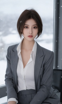 A stunning hubggirl, mid-twenties milf, with medium-short dark brown hair framing her striking features. Her double eyelids sparkle under a sassy, seductive gaze. The camera captures the natural curves of her medium breasts and long legs beneath a grey tight-fit suit and crisp white shirt. She sits confidently on an office chair, surrounded by the snowy sky's heavy snowfall outside the office window. The subject's exquisite skin texture shines with detailed realism, while the fabric textures of her outfit appear lifelike under the soft light.