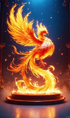 3d\(hubgstyle)\,a elegant and very elegant burning phoenix with very long tail feathers,above a round podium,Surrealism Dream Style,West Journey Style,
