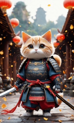 An ancient anthropomorphic cat samurai using an ancient samurai armor,photography,beautiful,bokeh temple background,colorful,masterpieces,top quality,best quality,official art,