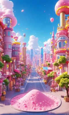 building,circular,powder,city background,pink,cartoon,