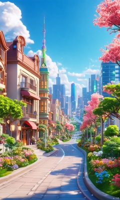 3D_style, outdoor, spring, and urban architectural scenery, creating vitality and joy.