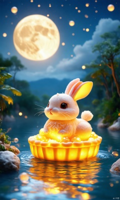 Bunny boat in water, clay, Bubble Matt Style, beautiful3D Ul moon cakes, a 3D moon model with yellow glow,miniature landscape, soft color,