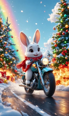 Christmas theme, furry,cute,(a bunny riding a motorcycle:1.1),rabbit,solo,(motor vehicle:1.2),riding,scarf,running on the rainbow,tree,extreme perspective,looking up at the camera,rainbow,fire spray,speed,humorous,
