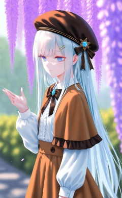 masterpiece,best quality,high quality,loli,[Artist:wlop],[[Artist:sheya]],Artist:hiten_(hitenkei),1girl,solo,long hair,hat,blue eyes,long sleeves,hair ornament,flower,skirt,shirt,wisteria,white shirt,beret,very long hair,brooch,brown headwear,brown skirt,closed mouth,white hair,puffy sleeves,frills,blue hair,outdoors,bow,hand up,black headwear,ribbon,puffy long sleeves,blurry,brown capelet,