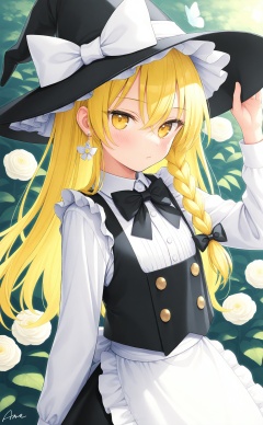 masterpiece,best quality,high quality,loli,Artist ame929,1girl,hat,kirisame marisa,blonde hair,solo,yellow eyes,bug,witch hat,butterfly,long hair,braid,bow,flower,apron,black headwear,single braid,long sleeves,hair ornament,earrings,jewelry,white bow,hair flower,shirt,white shirt,closed mouth,hair between eyes,waist apron,white apron,black bow,white flower,hat bow,black skirt,blush,bowtie,skirt,black bowtie,looking at viewer,rose,hair bow,vest,black vest,frills,signature,buttons,hand on headwear,