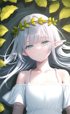 masterpiece,best quality,high quality,loli,[Artist miwano rag],[Artist toosaka asagi],[Artist wlop],[Artist chen bin],loli,sketch,traditional_media,1girl,solo,elf,green eyes,silver hair,green gradient hair,(long hair),blunt bangs,white dress,off-shoulder,laurel wreath,(upper body),expressionless,half-closed eyes,close-up,looking at viewer,(chibi:0.1),lying,on back,in water,gingko leaf,meadow,from above,masterpiece,bestquality,line art,