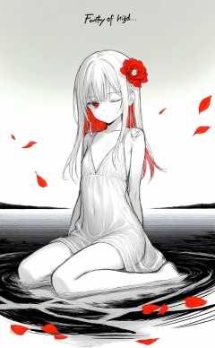 masterpiece,best quality,high quality,loli,1girl,red eyes,white long translucent night gown,expressionless,(white hair),hair cover one eye,long hair,red hair flower,kneeling on lake,blood,(plenty of red petals:1.35),(white background:1.5),(English text),greyscale,monochrome,greyscale,monochrome,sketch,