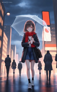 masterpiece,best quality,high quality,loli,[Artist:wlop],Artist:hiten_(hitenkei),[[Artist:sheya]],umbrella,scarf,holding umbrella,rain,skirt,outdoors,holding,1girl,red scarf,brown hair,bag,sky,blue skirt,night,pleated skirt,shoes,socks,coat,sneakers,looking at viewer,short hair,shirt,brown eyes,1boy,transparent,transparent umbrella,city,building,open clothes,standing,cloud,walking,long sleeves,white shirt,cloudy sky,jacket,parted lips,sign,miniskirt,shoulder bag,lamppost,open coat,solo focus,full body,road sign,