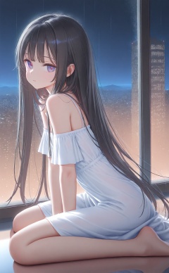 masterpiece,best quality,high quality,loli,(artist:ningen_mame:0.9),(artist:sho_(sho_lwlw):0.9),(artist:rhasta:0.9),(artist:wlop:0.7),(artist:ke-ta:0.6),(fkey:0.5),(tianliang duohe fangdongye:0.5),(hiten \(hitenkei\):0.6),loli,1girl,long hair,solo,dress,very long hair,black hair,rain,sitting,reflection,white dress,cityscape,off shoulder,skyscraper,window,city,building,indoors,looking at viewer,bare shoulders,city lights,short sleeves,barefoot,reflective floor,off-shoulder dress,wariza,night,hand between legs,